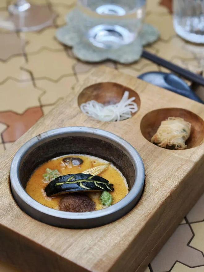 图片@ 陈冠丹 用干草炭烤冬菇青稞破酥包,蘸藏族香料素黄油,咬破对未知前路的期待,此时,最适合搭配一碗充满温暖慰藉感的核桃酥油蘑菇汤茶。黄芯乌塌菜被破布子和油渣果欢快地点缀,树花与羊肚菌带来了脆韧口感,苹果与奶渣则宛如牧人的问候。将白松露、奶皮子、苦荞、青稞连同小米炖制而成的一锅饭,清冽且富层次,饱含着冬日田园的况味。 图片@ 陈冠丹 接下来是一系列散发着交融感的边境饭食。金黄咖喱脆面Khao soi搭配海苔、金耳、竹耳与马蹄,以及绿豆、小黄姜、腌渍红毛丹和臭菜,复刻出泰北风味的韵致。由腌茶、包菜、宝珠梨、红柚、紫豆角和芭蕉花制成的沙拉,则暗藏湄公河的清澈悠长。热带气息浓郁的“火车头”,选取洋葱、四棱豆、绣球菌、罗勒和香茅草,交缠成百年前各国旅人的乡愁。“澜沧江”和“河口”,同样像是把宏大的地理跨度轻咬在口中。